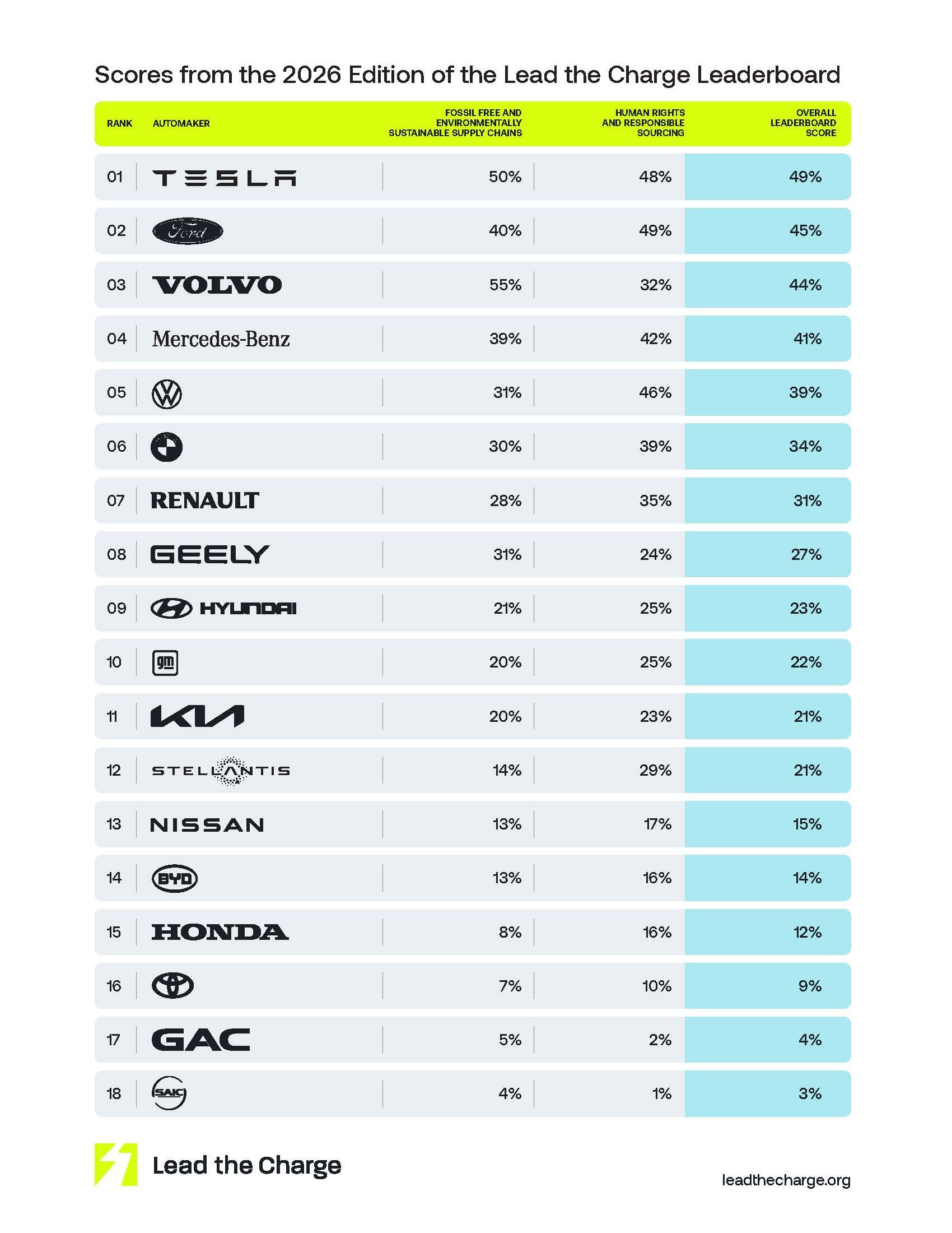The fourth edition of the Lead the Charge Auto Supply Chain Leaderboard, which ranks global automakers based on their efforts to build equitable, sustainable, and fossil-free supply chains for electric vehicles, shows clear momentum of carmakers cleaning up their supply chains.