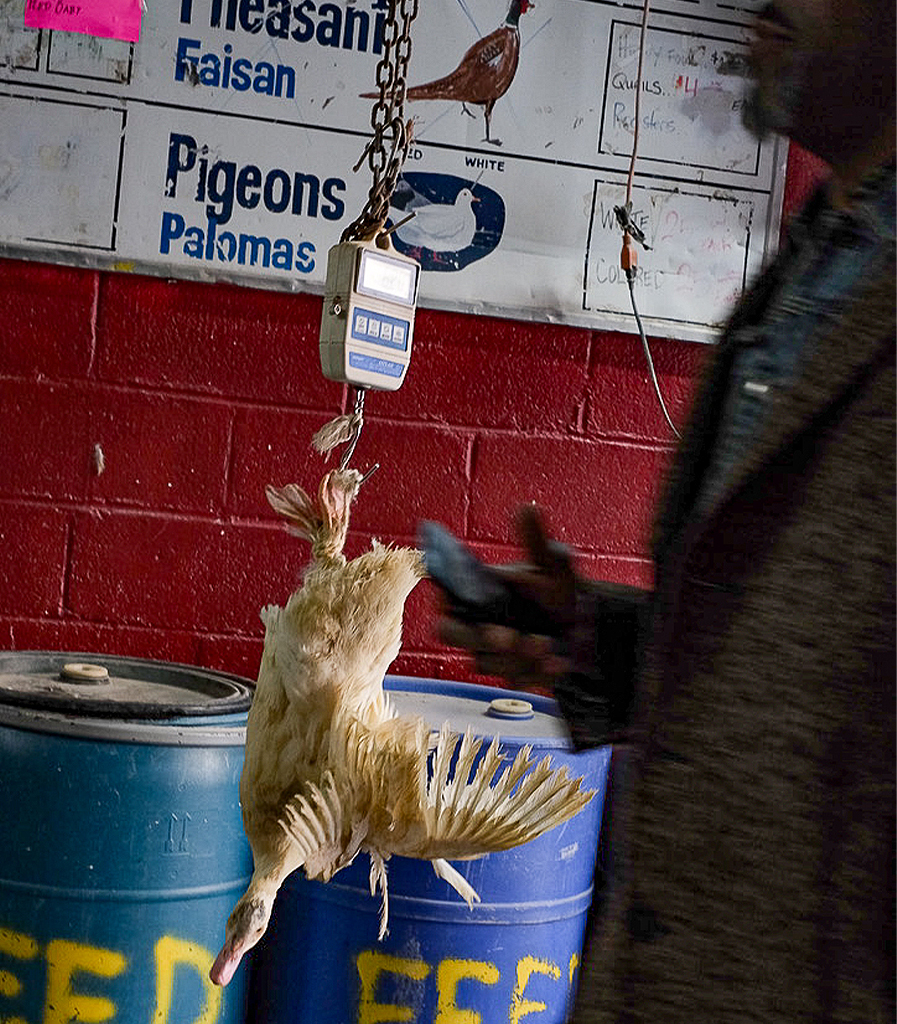 Banner image: A chicken (Gallus gallus domesticus) is weighed at a live poultry market in West Harlem as a customer stands nearby. The stacking of live animal cages allows bodily waste to drop into the cages below, facilitating disease spread. Image by Cate Twining-Ward.