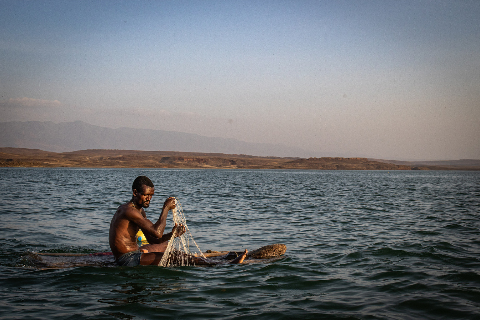 Just before dusk, as the harsh afternoon sun begins to soften and the wind subsides, Lekubo paddles out onto the lake on a traditional log raft to fish. “We depend on this lake — it is our daily bread,” he said, letting out a small hand-cast gill net into the jade-colored water.