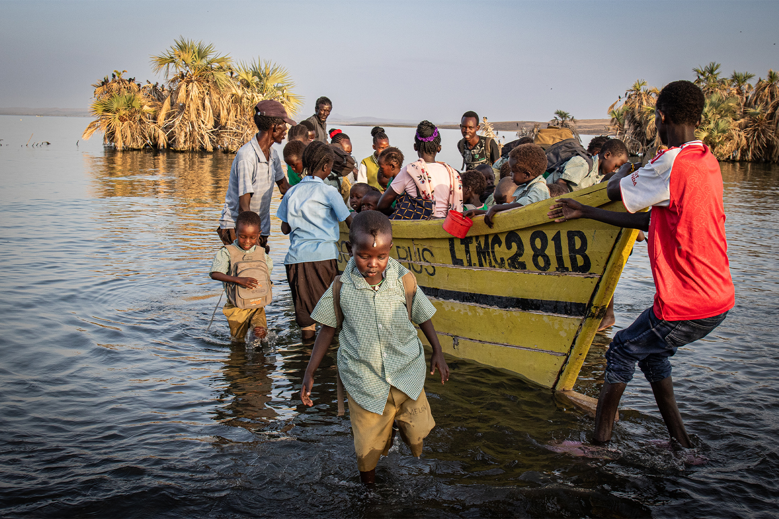 KOMOTE, Kenya — At sunrise on Komote Island, 36-year-old James Lekubo walks his two children down a rocky hillside to the water’s edge, where they clamber into a small fishing boat with a couple of dozen others to journey across a stretch of lake that didn’t exist a few years ago. On the other side lie their school and the nearest clinic — services that were previously within walking distance.