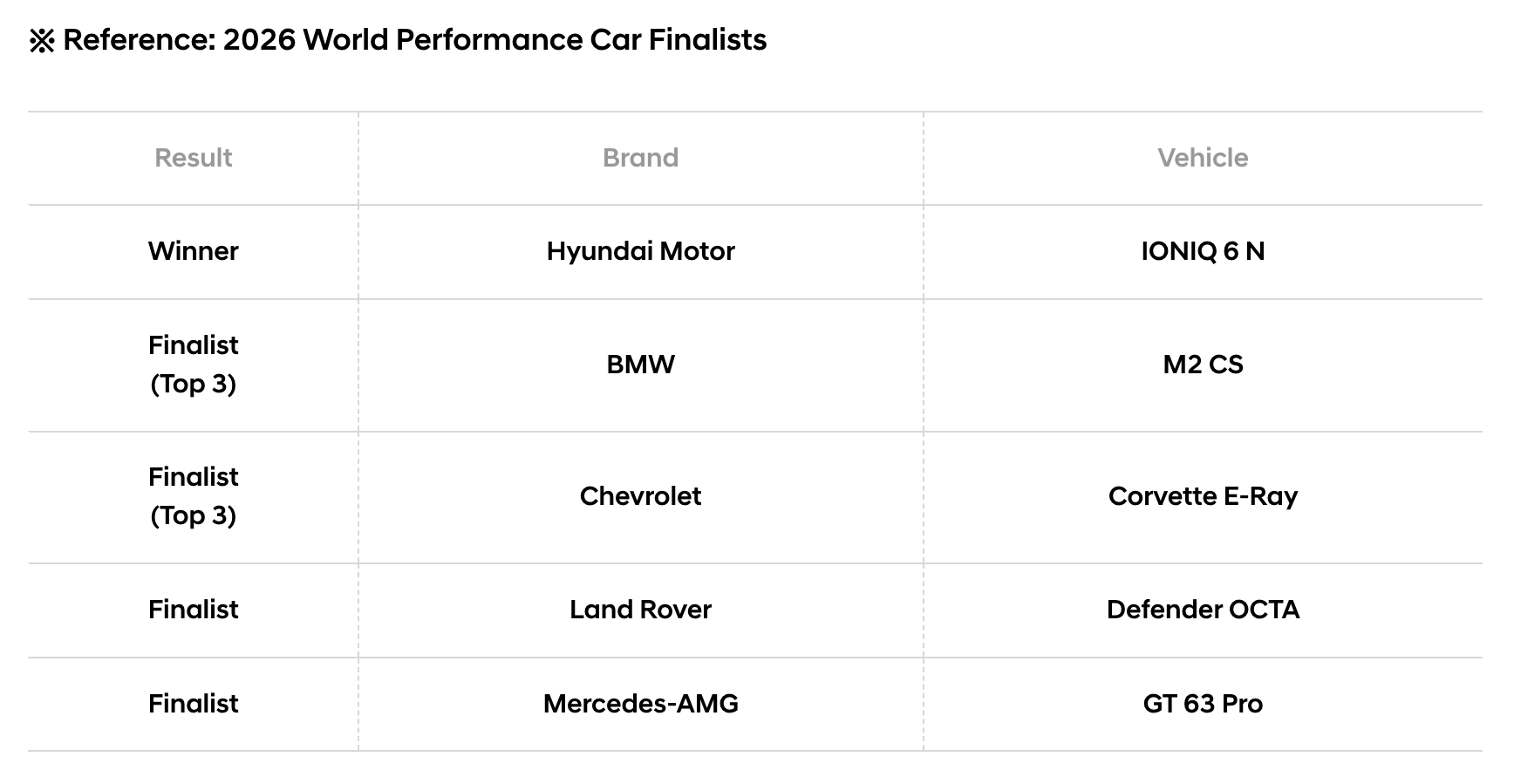 Since making its dynamic debut at the Goodwood Festival of Speed in the UK in July 2025, IONIQ 6 N has consistently received praise from leading automotive media. In January 2026, it was named Best Electric Performance Car at the 2026 What Car? Awards in the UK before earning Performance Car of the Year from the Korea Automobile Journalists Association the following month. Building on this success, IONIQ 6 N was named Best Driver’s Car at the 2026 TopGear.com EV Awards in April. IONIQ 6 N also won a 2026 iF Design Award in the Automotive Product category.