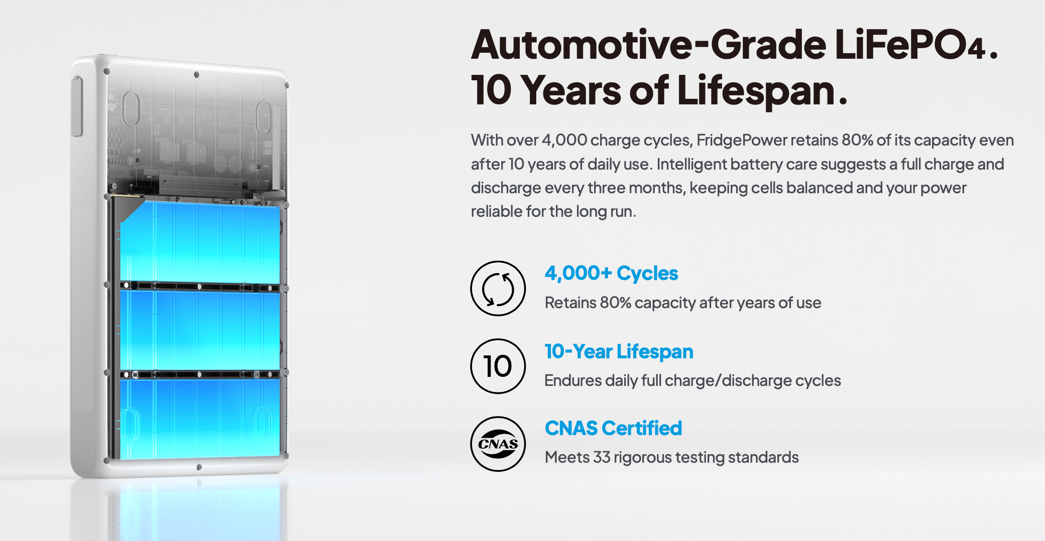Worried about longevity? The FridgePower battery will retain at least 80% of its original battery capacity for 10 years or 4,000 cycles. The system also has a clever schedule built in to fully discharge and charge the batteries every three months in order to keep the cells balanced and the system functioning well for longer.