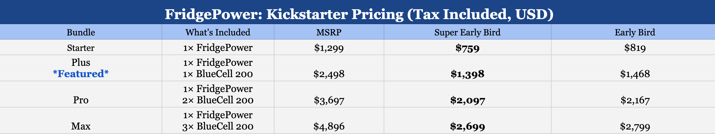 The BLUETTI FridgePower just debuted on Kickstarter, at 8:00 AM PT/11:00 AM ET on April 16. The Kickstarter campaign runs through May 31. The launch price for the FridgePower on Kickstarter starts at $759 for the standalone unit (42% off) and $1,398 for the FridgePower + BlueCell 200 bundle (44% off). These discounts are available via the limited Super Early Bird Tier. All Kickstarter pricing includes tax and shipping for the US market. Shipments are expected to begin in early June for early backers. Here are more pricing details: