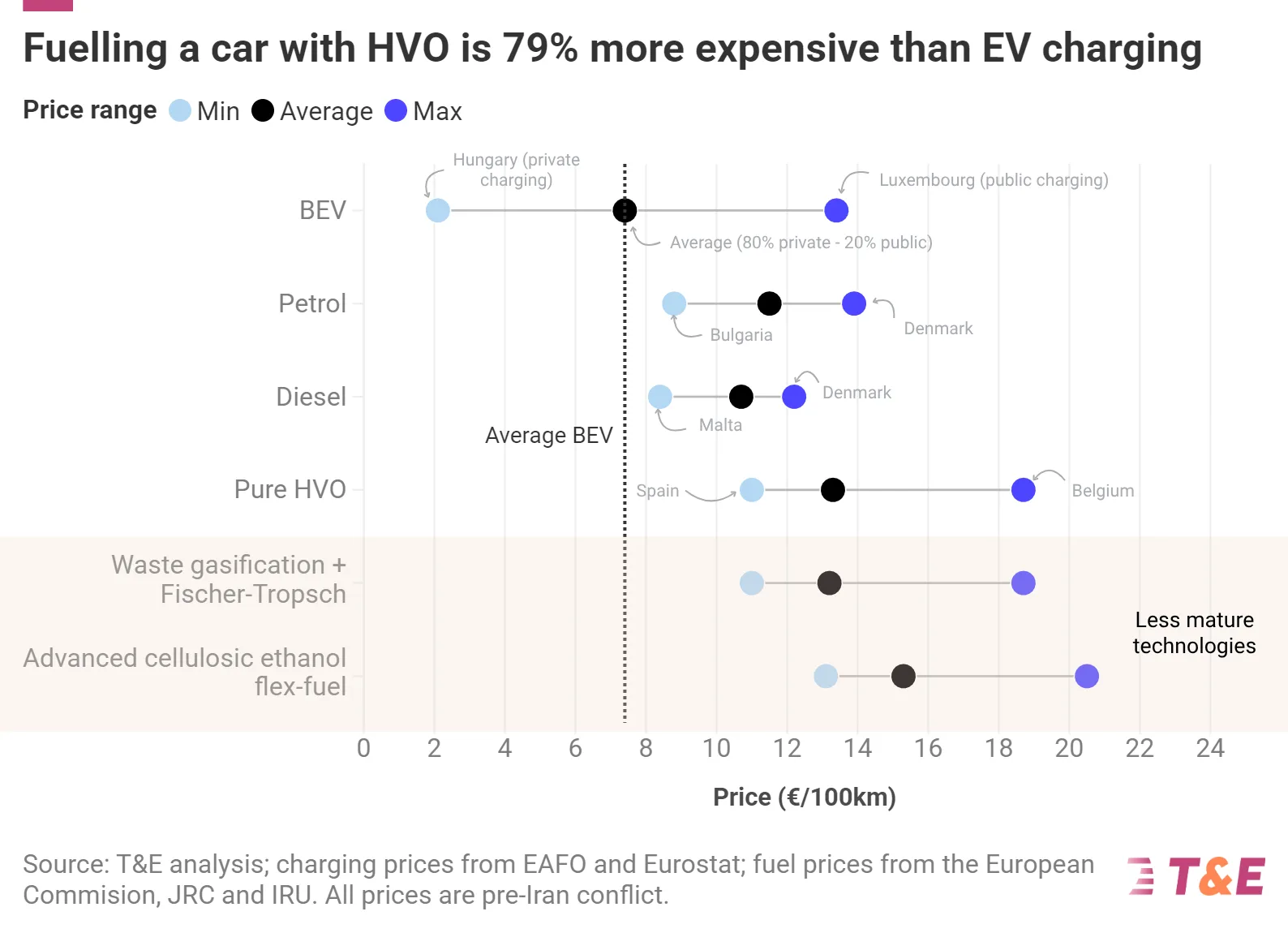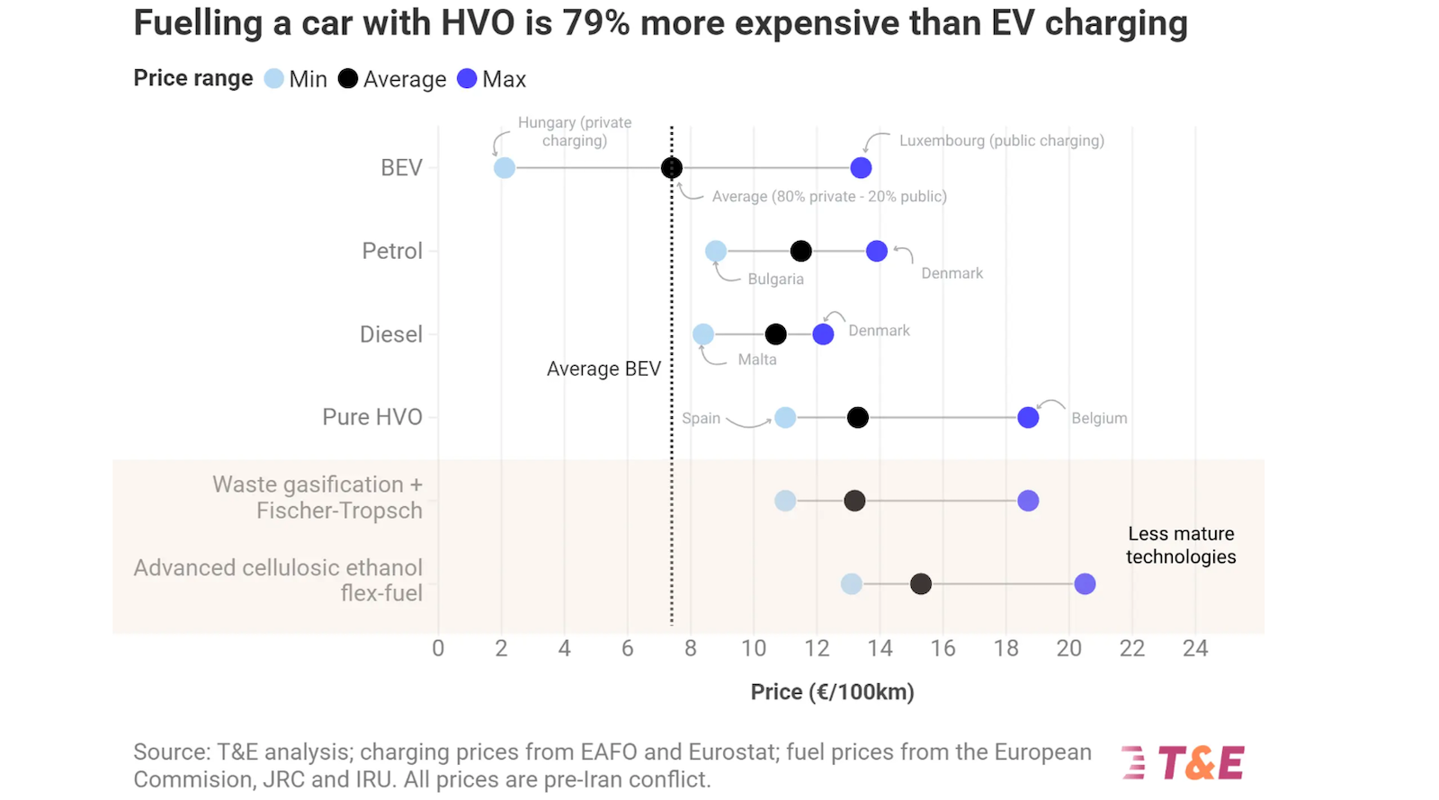 Charging an EV costs €7 per 100km driven, on average, in the EU — while pure HVO (hydrotreated vegetable oil) would cost €13 to cover the same distance, the T&E analysis finds. The German and Italian governments and the European car industry want to weaken EU car CO2 targets — which are a major driver of more affordable EV models — by counting combustion cars running on advanced biofuels as zero emissions. This is despite there not being enough advanced biofuels to go around.